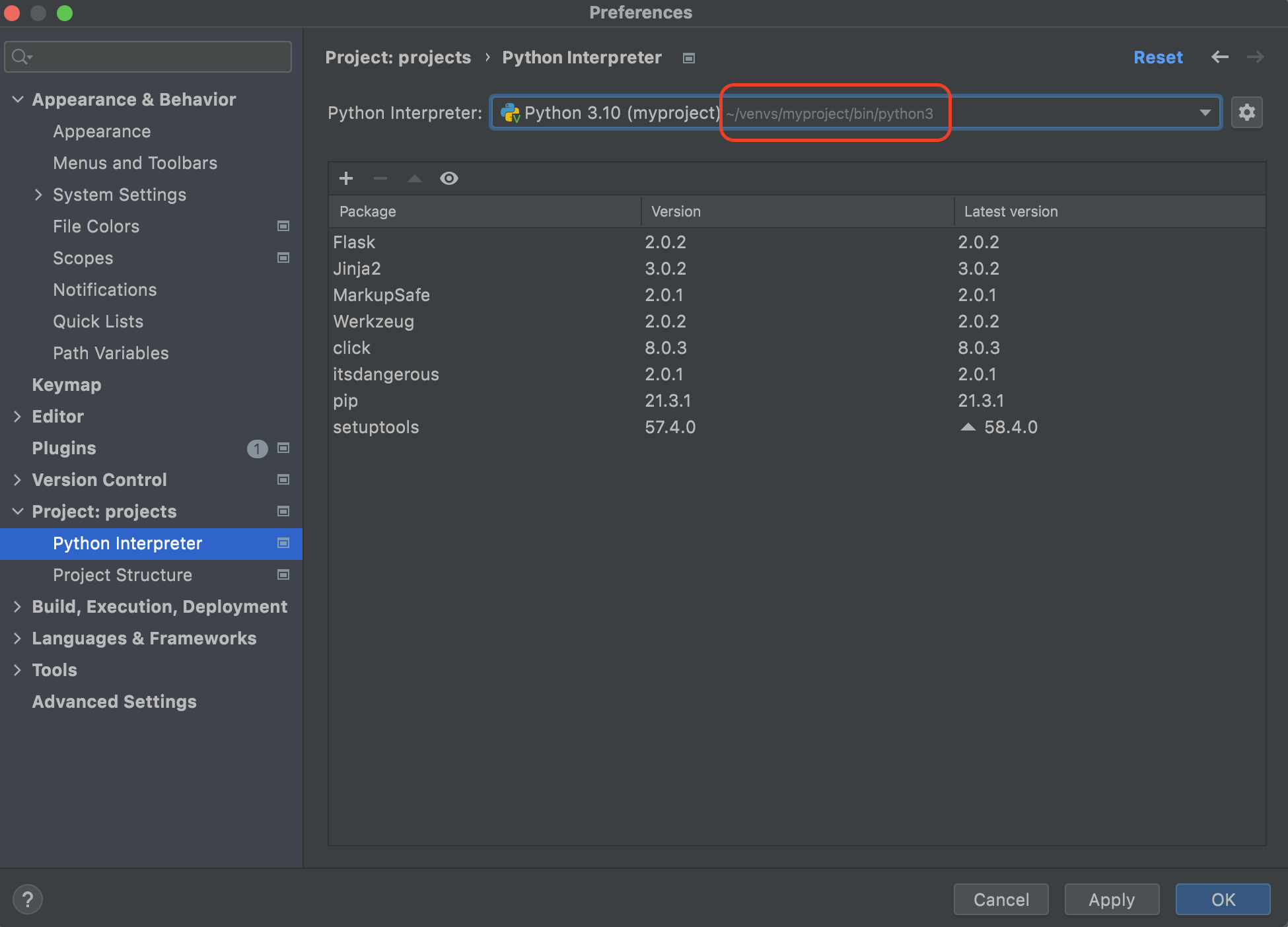 플라스크 프로젝트가 봐야하는 인터프리터로 설정해 주어야 한다.