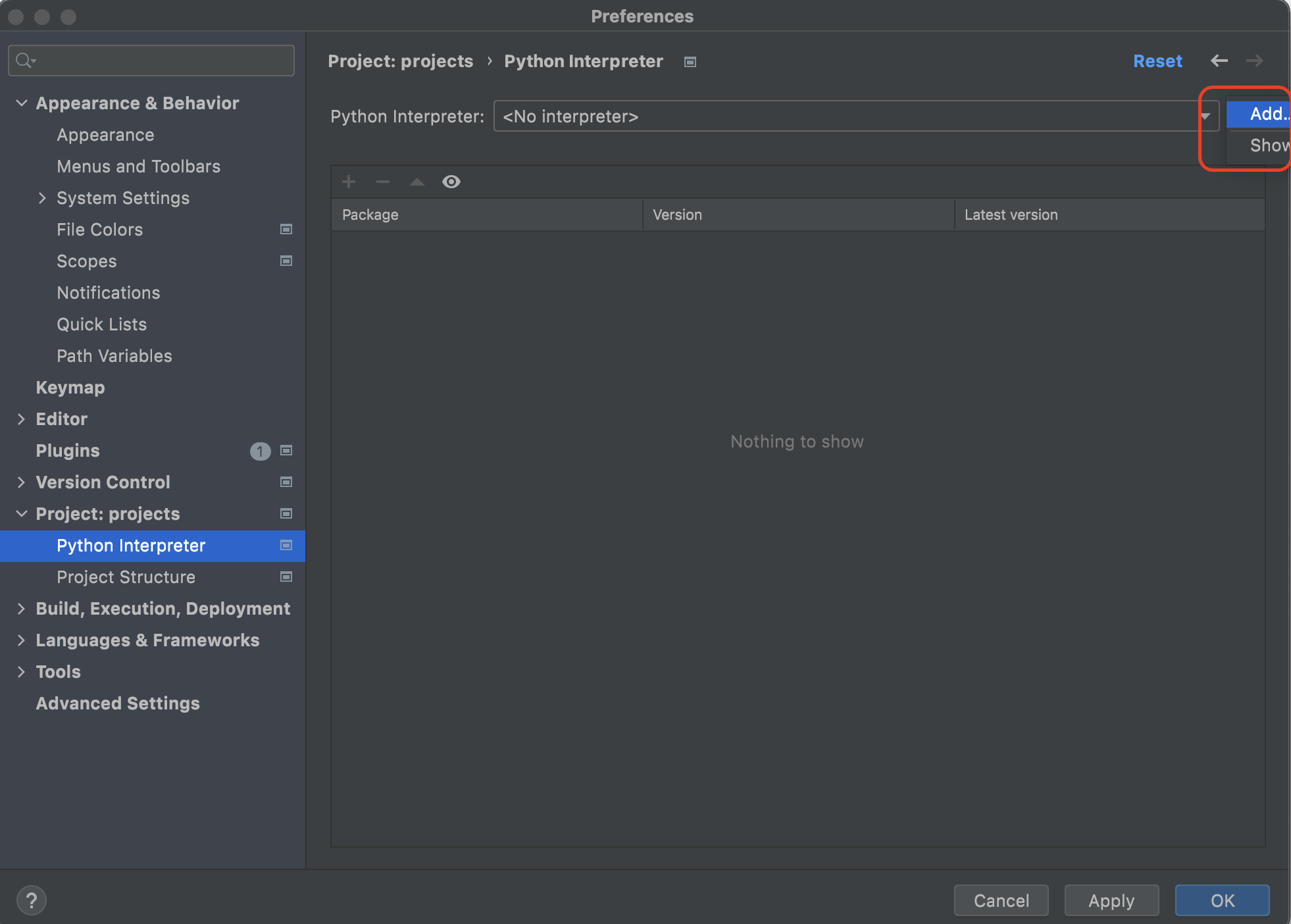 위 사진의 왼쪽을 참고해서 Python Interpreter 설정으로 들어간 다음 Add 를 눌러준다.